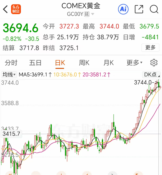 美联储宣布降息后,当地时间9月17日,国际黄金大跳水,盘中一度跌超1%!截至收盘,COMEX黄金期货主力合约跌0.82%,报3694.6美元/盎司。COMEX白银期货主力合约跌2.15%,报41.995美元/盎司。